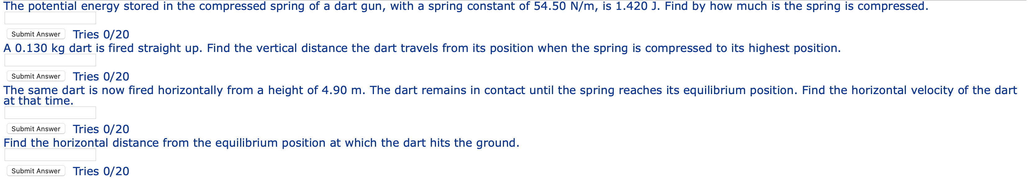 The potential energy stored in the compressed spring of a dart gun, with a spring constant of 29.00 n/m, is 0.580 j. the potential energy stored in the compressed spring of a dart gun, with a spring constant of 30.50 n/m, is 0.980 j. the potential energy of a compressed spring is given by the formula pe = (1/2)kx^2, where pe is the potential. If the spring constant is 200 n/m, what is the. If the spring is compressed 0.02 m prior to shooting the. the spring in a dart gun has a force constant k of 200 n/m. we can use a toy gun’s spring mechanism to ask and answer two simple questions: the potential energy stored in the compressed spring of a dart gun, with a spring constant of 62.50 n/m, is 0.540 j. C) 0.7 \, m 0.7m. (a) how much energy is stored in the spring of a tranquilizer gun that has a force constant of 50.0 n/m and is compressed 0.150 m?